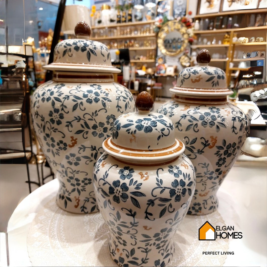 This beautifully crafted lidded ceramic jars features a delicate blue floral print over a warm ivory base, finished with classic brown accents. Perfect as decorative pieces or for elegant storage.
